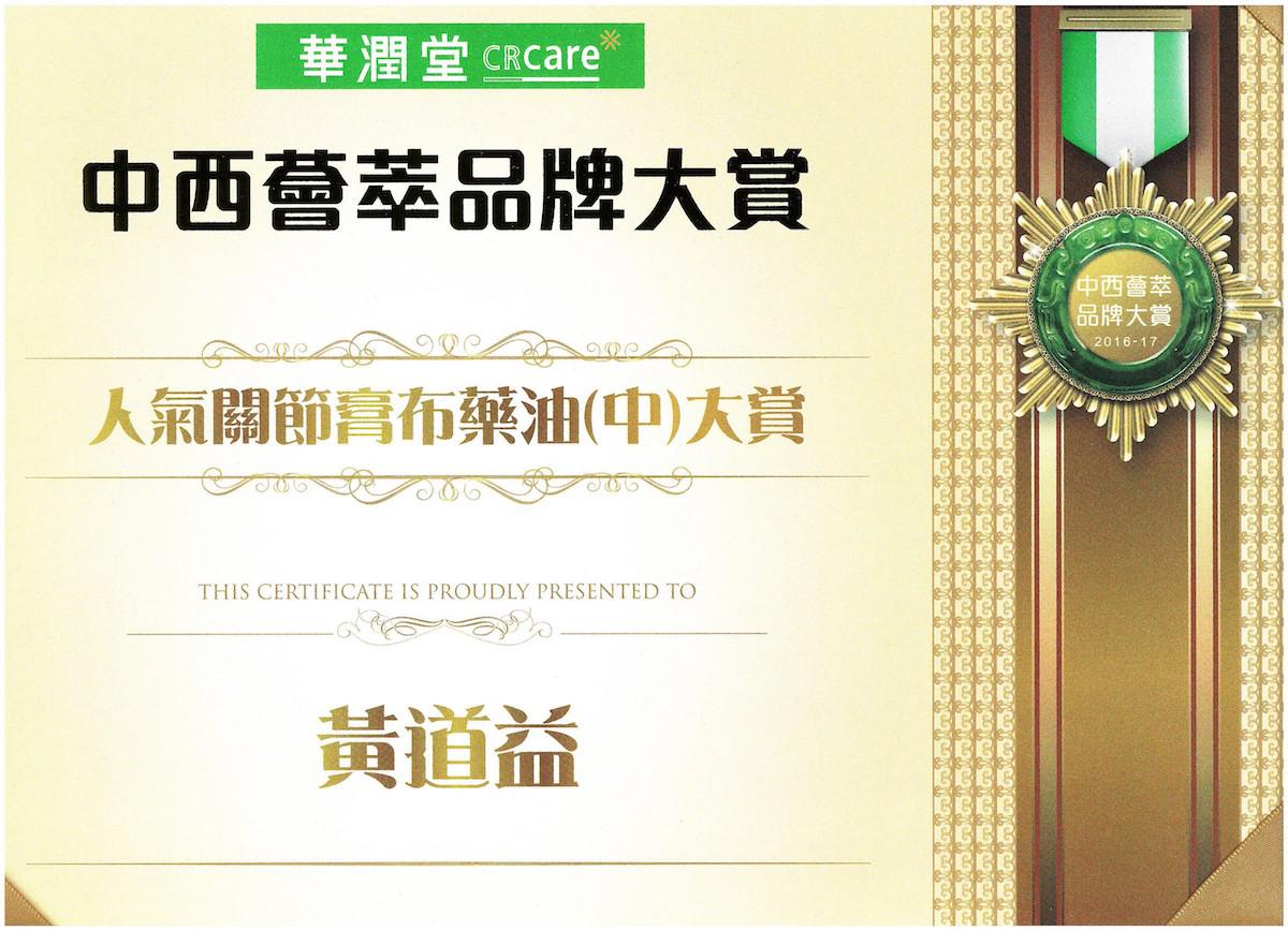 2016年華潤堂中西薈萃品牌大賞-人氣關節膏布藥油(中)大賞